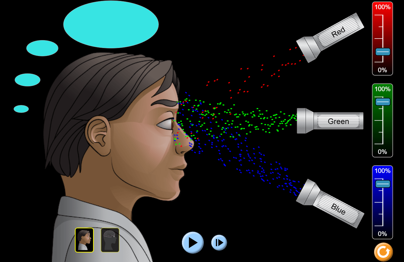 Klik op de knop hieronder en speel eens met die RGB lampen. Probeer een een kleur te maken door de rode, groene en blauwe lamp meer of minder aan de te zetten. Je zult merken dat het heel anders werkt dan het mengen van verf. Meng je blauwe en gele verf dan krijg je groen. Met licht is dat totaal anders!